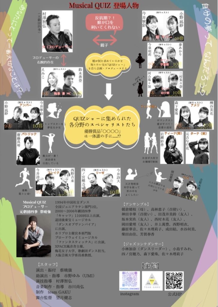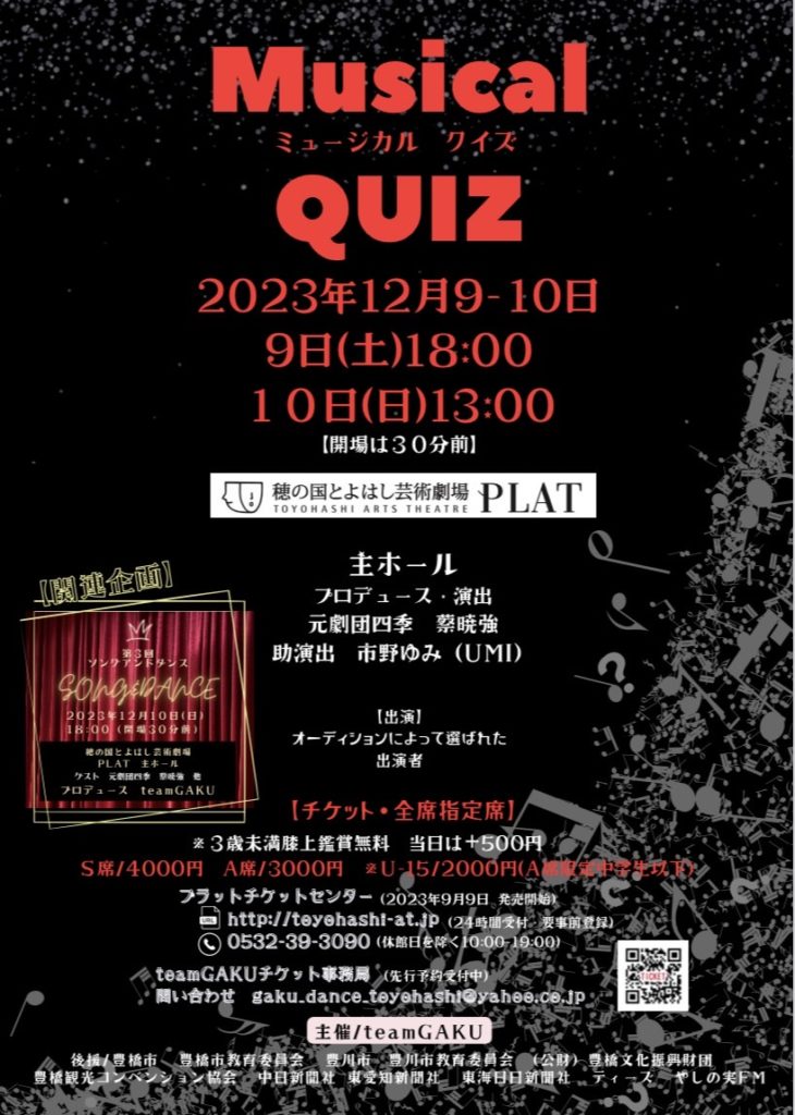 公演2023.12.10ミュージカル「QUIZ」 \\ミュージカル QUIZ//上演いたしました!ご来場ありがとうございました【日時】2023年12月9日(土) / 10日(日) 13:00~ 17:00~【場所】穂の国とよはし芸術劇場【主催】teamGAKU【演出】蔡暁強